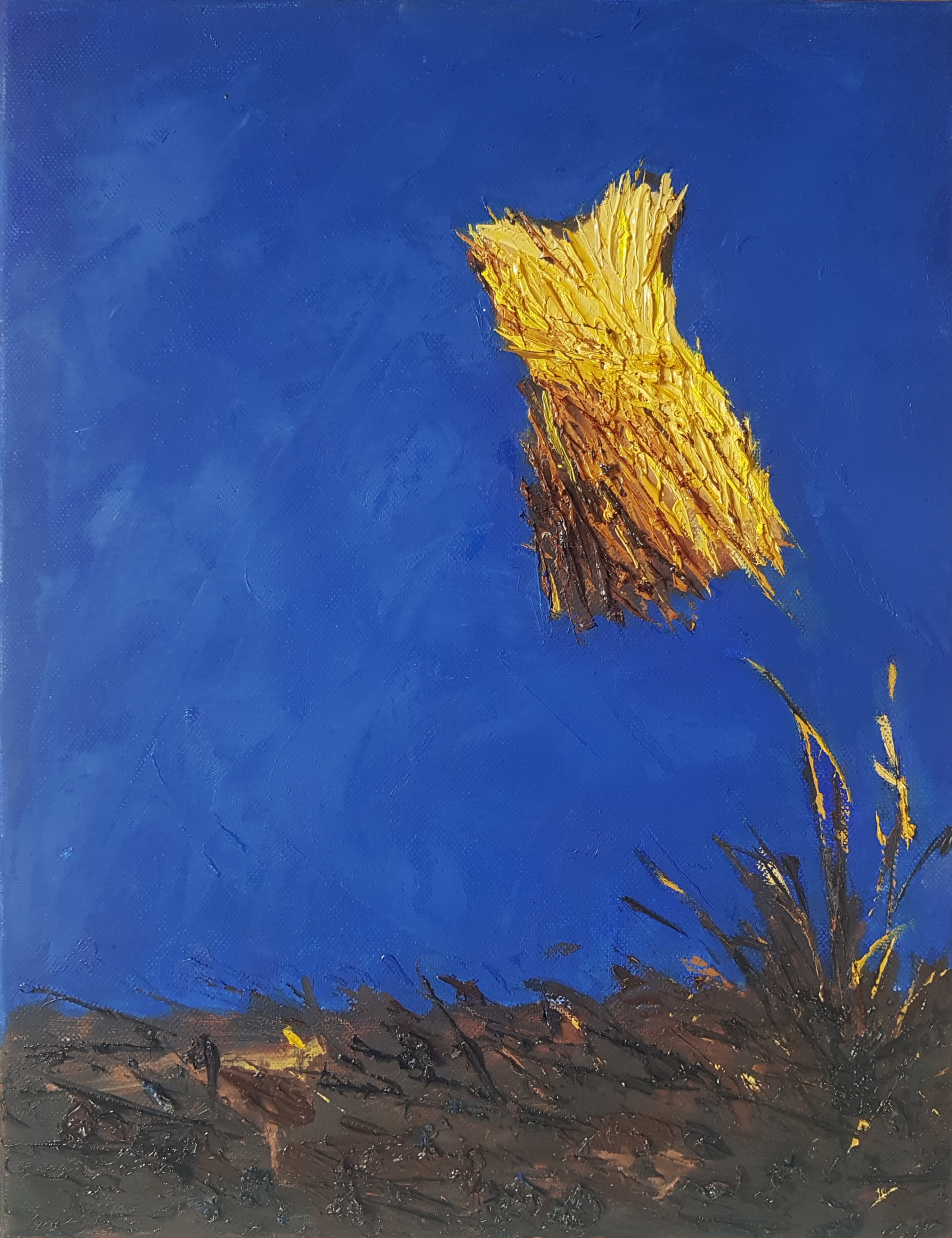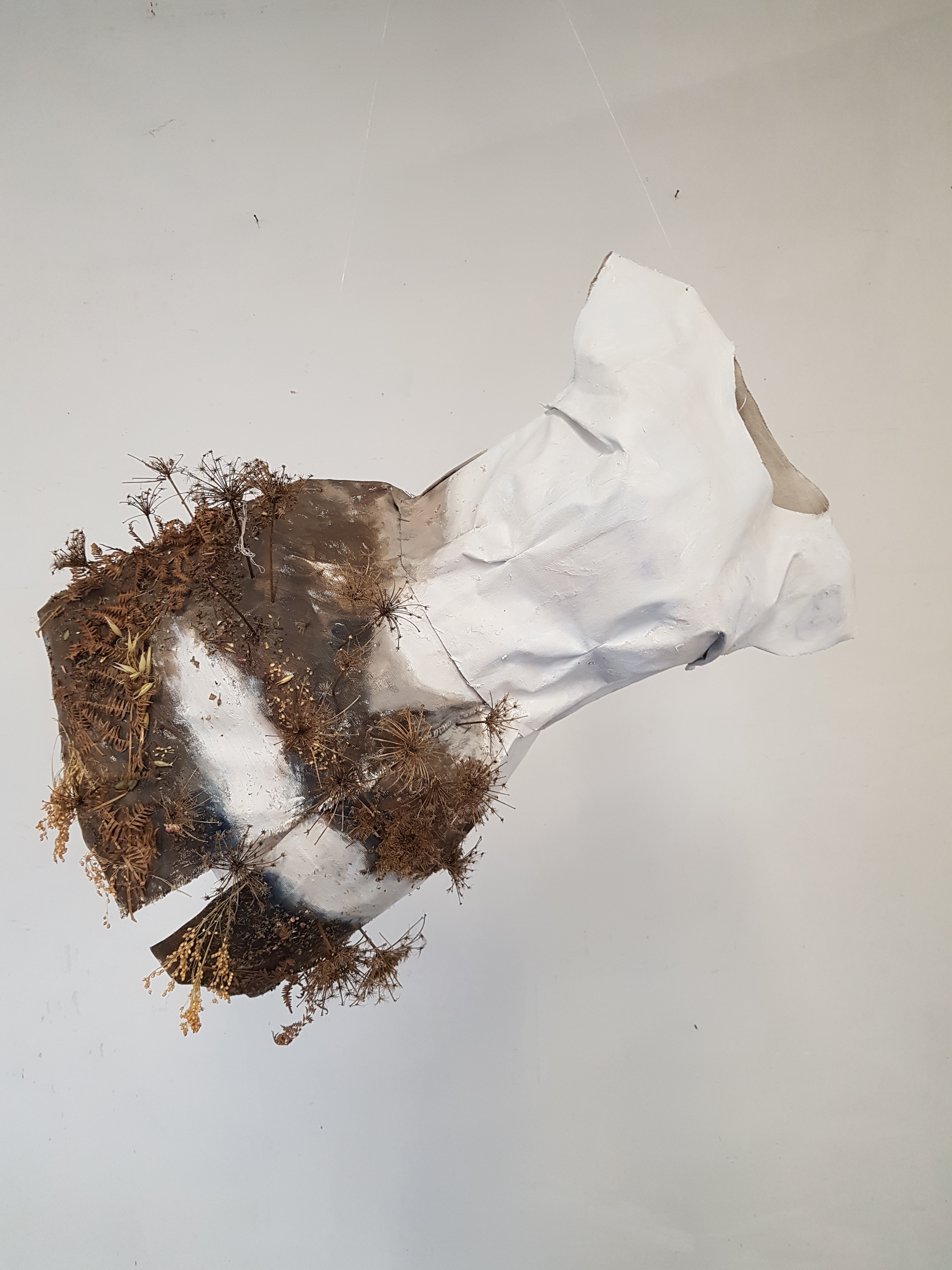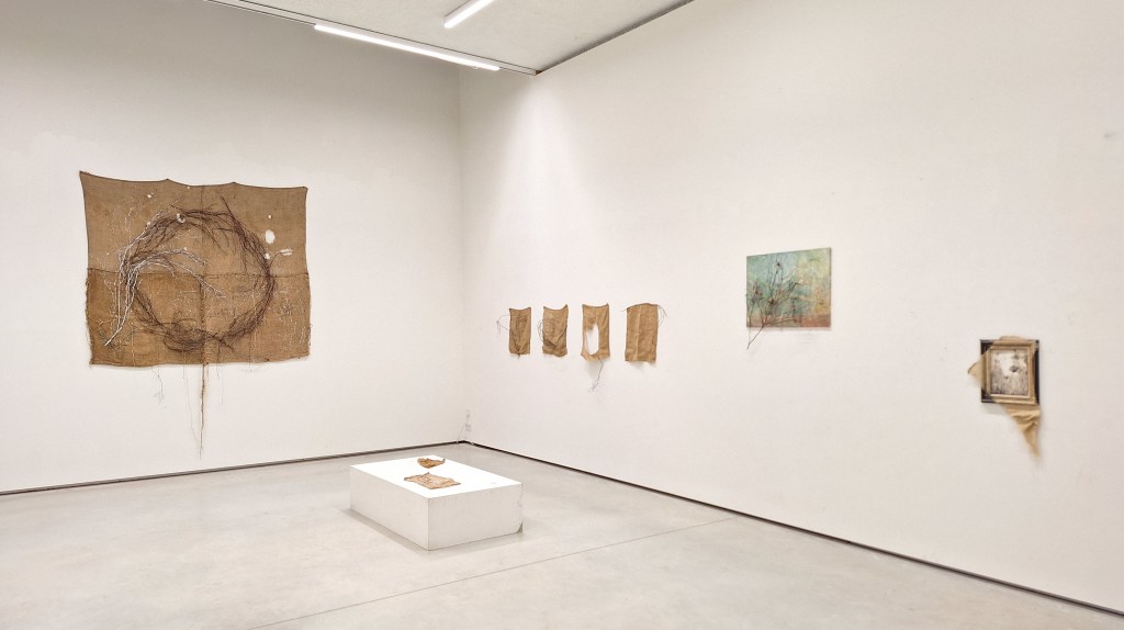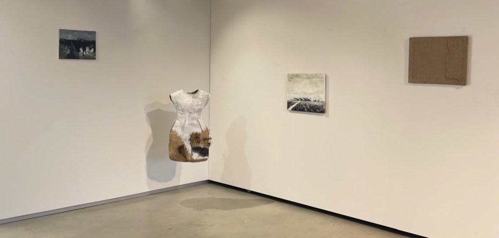 Het werk van Joyce Westerink visualiseert een wereld met sporen van menselijke aanwezigheid. Soms in de vorm van surrealistische landschappen – dan er zitten ogen in de aarde, vliegen er jurken door de lucht of, vreemder nog, zijn de landschappen bovenop een jurk geschilderd. Soms ook zijn haar jurken versteend in een schil van emotie, zodat de vroegere bewoonster nog te herkennen is. Altijd is er de natuur waarin ooit mensen hebben geleefd.